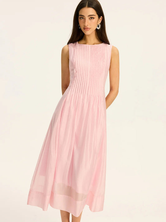 Pink Semi-Sheer Tencel Pleated Sleeveless Midi Dress